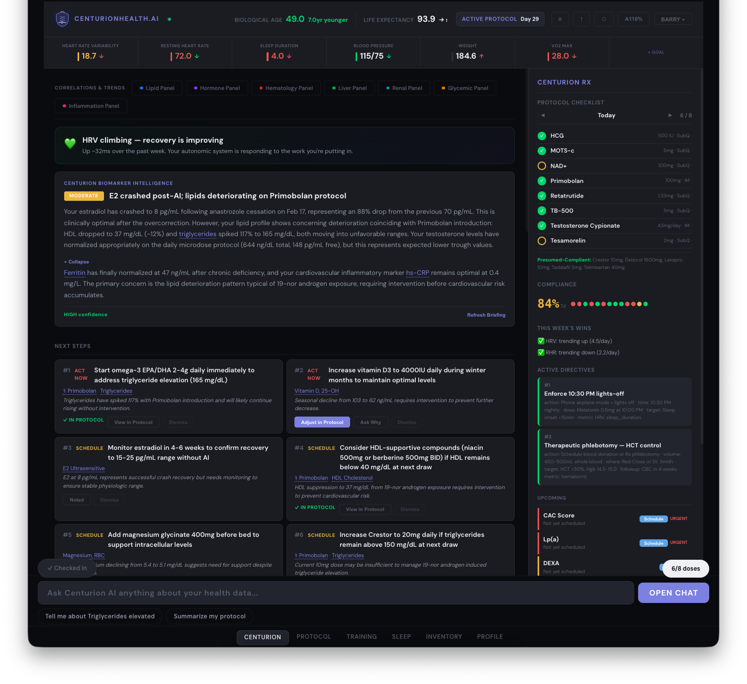 Centurion ingests your biomarkers, protocols, and outcomes — models what's happening inside your body — and generates specific, prescriptive next steps aligned to your healthspan and longevity goals.