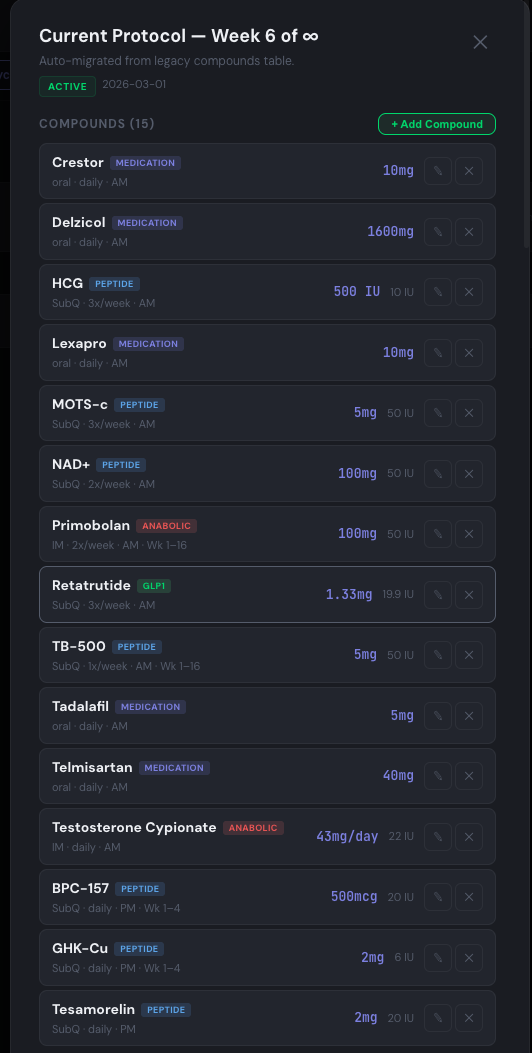 Sleep architecture. Peptide response windows. Severity-coded biomarker cards. Hepatic safety overlays. Eleven-draw deep-dives. Titration history per compound. Upcoming scans and the daily watchers behind them. Today's syringe-by-syringe checklist.